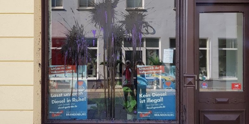 Berlin, 23. Juli 2018. In der Nacht zum Montag wurde das Gemeinschaftsbüro der Brandenburger AfD-Bundes- und Landtagsabgeordneten in Cottbus mit Farbbeuteln attackiert. Nachdem vor zwei Wochen im Umfeld des Büros Häuser und auch eine Synagoge mit dem Schriftzug „FCK AFD“ verunstaltet wurden, flogen dieses Mal mehrere schwarze und lilafarbene Farbbomben gegen Frontscheibe, Fensterbretter und Außenwände des Büros in der Mühlenstraße. Die Mitarbeiter des Büros haben bei der Polizei Anzeige erstattet (AZ: V10-109-7545).